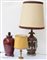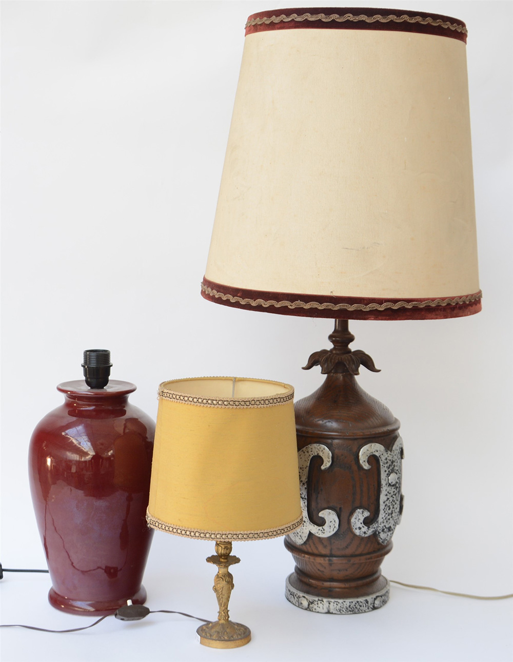Lotto composto da un'abat-jour in legno, un candeliere montato a luce elettrica ed una base per lampada in porcellana color "sangue di bue" (difetti)