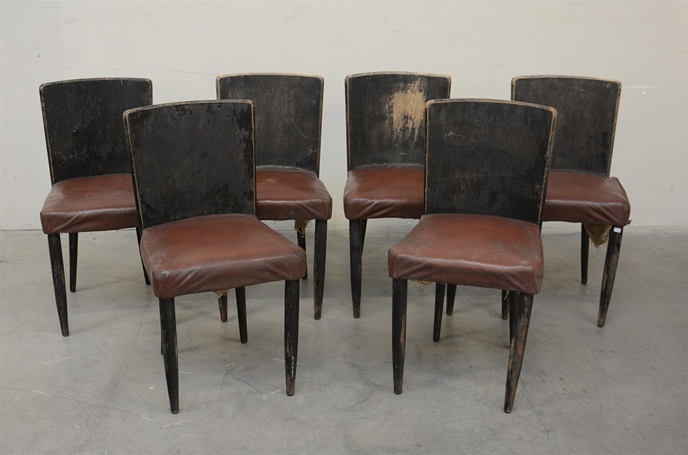 Gruppo di sei sedie in legno con schienale curvo e seduto in cuoio, anni 40 (gravi difetti)