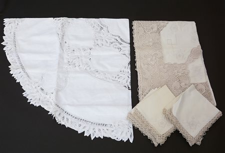 Lotto di due tovaglie in tessuto e pizzo con decori ricamati a mano. Anni '50...