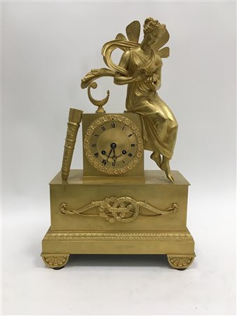 Pendola da camino in bronzo dorato decorato nella parte superiore con figura di Diana a tuttotondo, quadrante a numeri romani iscritto Leron a Paris. Parigi, carica settimanale suoneria ore mezze e campanello (difetti)