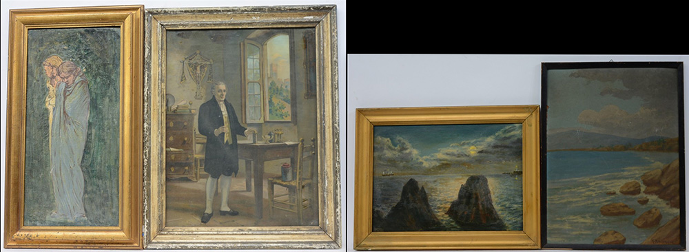 Lotto composto da tre dipinti ad olio ed un'oleografia di soggetto differente in cornice (difetti)