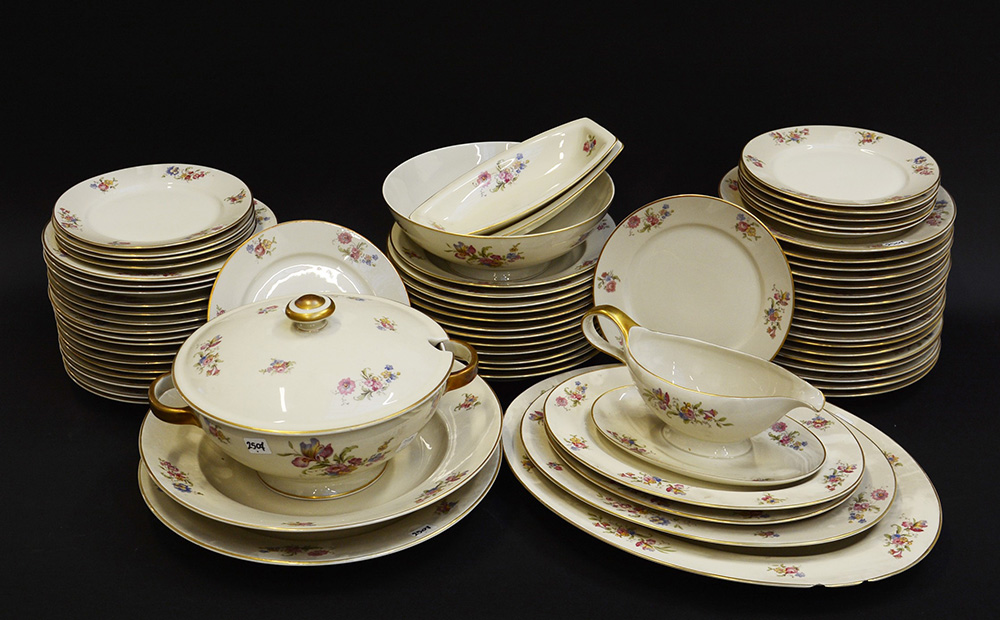 Manifattura di Rosenthan - Servizio da tavola in porcellana decorata con mazzetti di fiori sparsi su fondo cream e profili dorati, composto da dodici piatti fondi, trentaquattro piatti da coltello, undici piattini da frutta, quattro piatti da portata ovali e due tondi, due antipastiere, insalatiera, zuppiera e salsiera; (difetti)