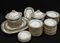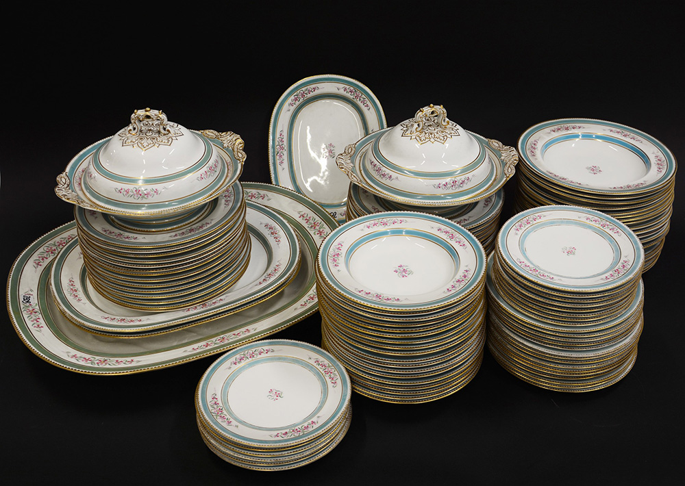 Manifattura inglese, Copeland - Servito da tavola in porcellana dipinta con filettature azzurro/verde e oro e gruppetti di fiori su fondo bianco, composto da diciotto piatti da minestra grandi e diciotto più piccoli, ventotto piatti da carne e quindici da pesce, quindici piattini da frutta, quattro piatti da portata ovali e due zuppierine con coperchi; fine secolo XIX (gravi difetti e restauri)