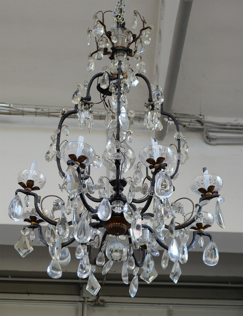 Manifattura di Boemia, grande lampadario a otto luci con struttura in ferro battuto e sagomato, fusto centrale con vaso in cristallo sfaccettato e pendenti in cristallo e cristallo di rocca di forme differenti. Sec XIX (diam cm 90 x h cm 130 ca) (difetti e mancanze) -EN A Boemian crystal chandelier. 19th century (defects)