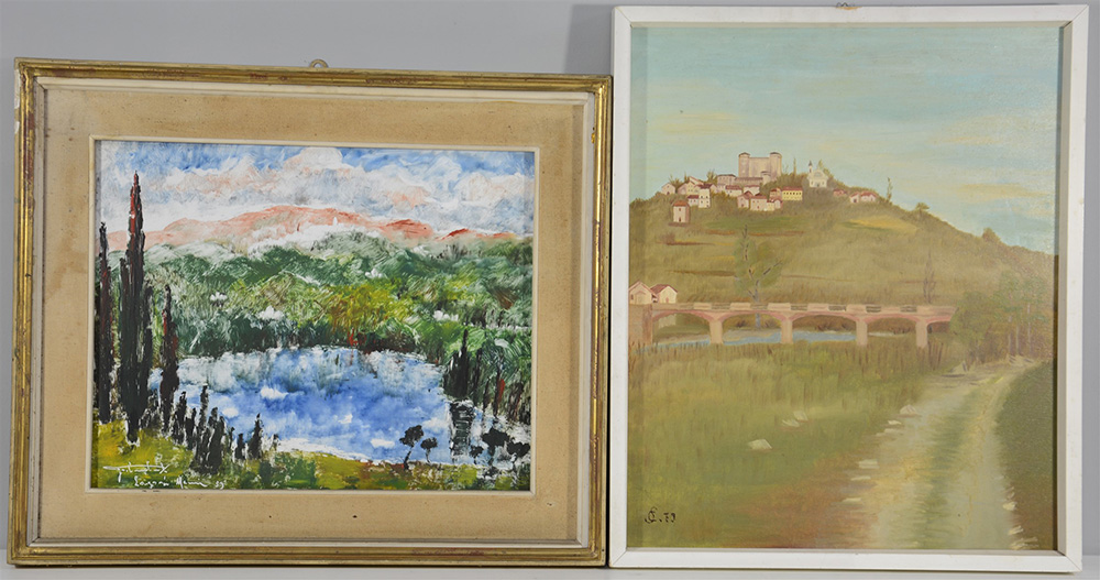 Lotto di due dipinti, su tela e lamiera, raffiguranti un paesaggio collinare con castello e un paesaggio lacustre, autori differenti (rispettivamente cm 59x49 e 40x50), in cornici (difetti)