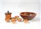 Lotto composto da una grande ciotola ed un contenitore con coperchio in legno e sei ciotole in metallo dorato (difetti)