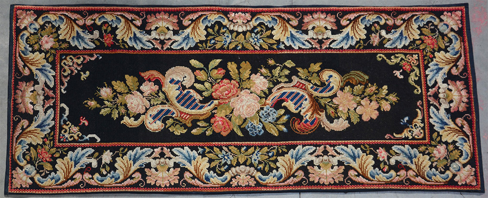 [Tappeti] Piccolo punto "gros point", Francia, sec. XIX. Realizzato in lana su canovaccio in fibra vegetale. Disegno a medaglione con volute, foglie e fiori policromi su fondo nero. Bella bordura con foglie d'acanto e mazzetti di fiori (cm 180x74) (lievi difetti)