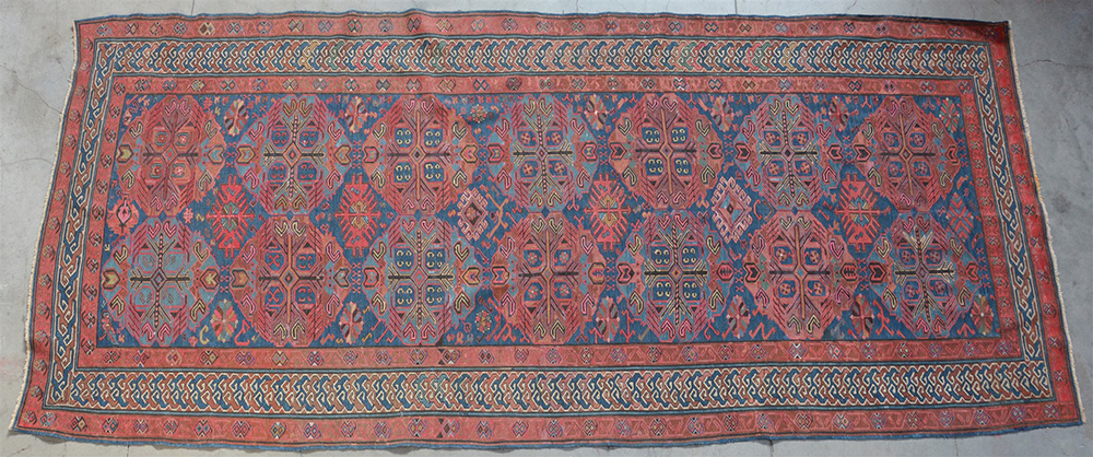 [Tappeti] Tappeto Sumak, Caucaso, inizio secolo XX. Disegno con due file di medaglioni ottagonali nei toni dell'azzurro, rosso, rosa e marrone su fondo azzurro (cm 328x153) (difetti)