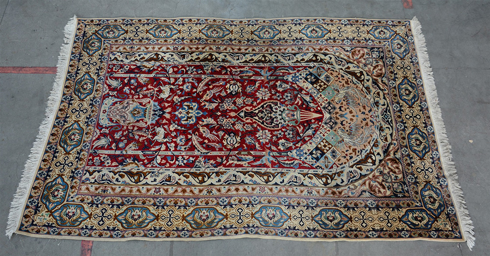 [Tappeti] Tappeto Nain, Persia, sec XX. Annodato in lana e seta. Disegno a preghiera con Mirab a fondo rosso decorato con rami fioriti e volatili con lampada votiva (305x218 cm) con certificato (difetti)