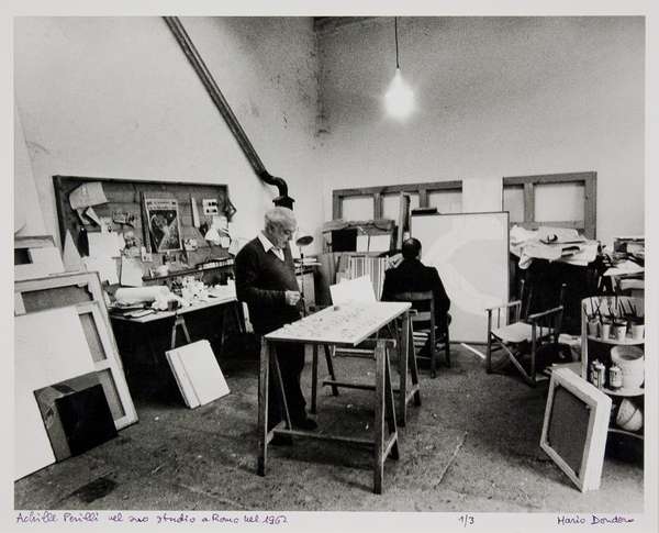 Mario Dondero Achille Perilli nel suo studio a Roma nel 1962 – 1962 fotografia in bianco e nero, es. 1/3 cm. 40x49 Firma in basso a dx Bibliografia: Mario Dondero Ritratti dell'intelligenza,Adriano Parise Editore, Colognola ai Colli (VR),2005, pag. 34
