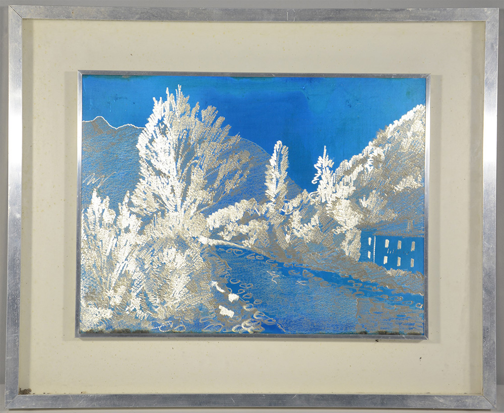 Umberto Lilloni (Milano 1898 - 1980) "Ruscello con alberi" multiplo su lastra d'argento (cm 30x40). Etichetta al retro della Galleria alla Chiave, Venezia, ed. 25/100. In cornice (difetti)