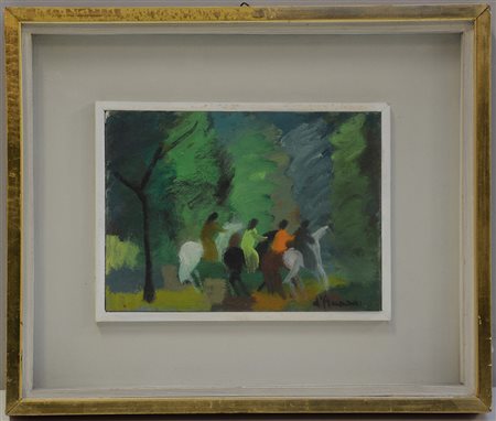 Gian Rodolfo D'accardi (Palermo 1906 - Varese 1993) "Figure a cavallo" olio su cartoncino (cm 15,5x21,5) firmato in basso a destra. In cornice (lievi difetti)