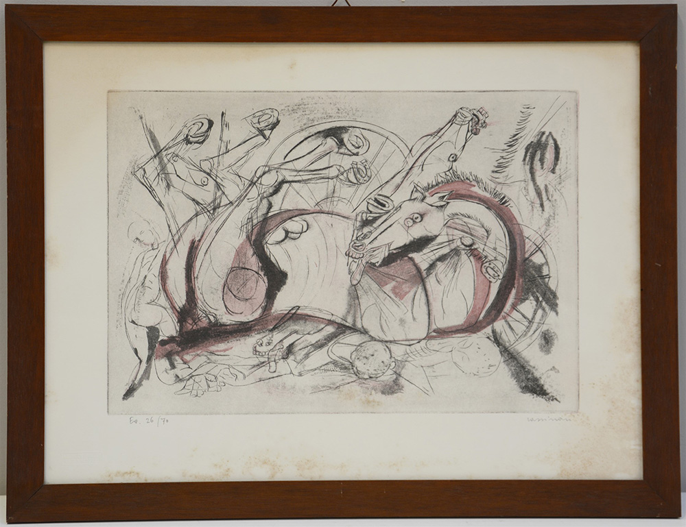 Bruno Cassinari (Piacenza 1912 - Milano 1992) "Senza titolo" acquaforte e acquatinta (lastra cm 26x38; foglio cm 36x49)numerato 26/70 e firmato in basso a matita. Timbro a secco in basso a sinistra "Luigi De Tullio Stampatore". In cornice (difetti)