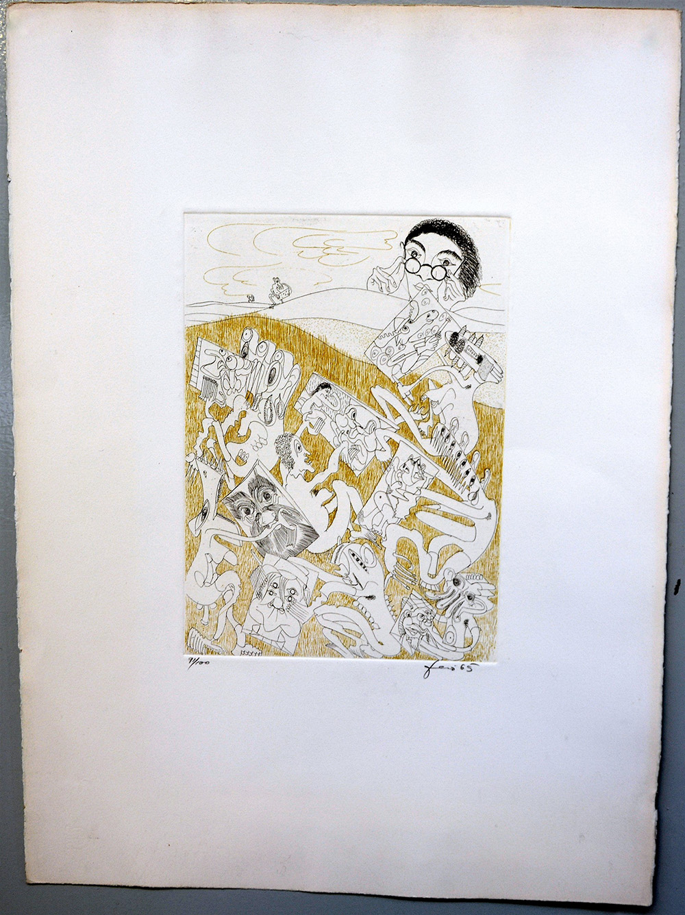 Errò (Ólafsvík 1932) "Senza titolo" 1965, acquaforte (battuta cm 31,5x22,5; foglio cm 64x46,2) numerata 91/100, firmata e datata in basso a matita. Filigrana visibile in basso a sinistra.