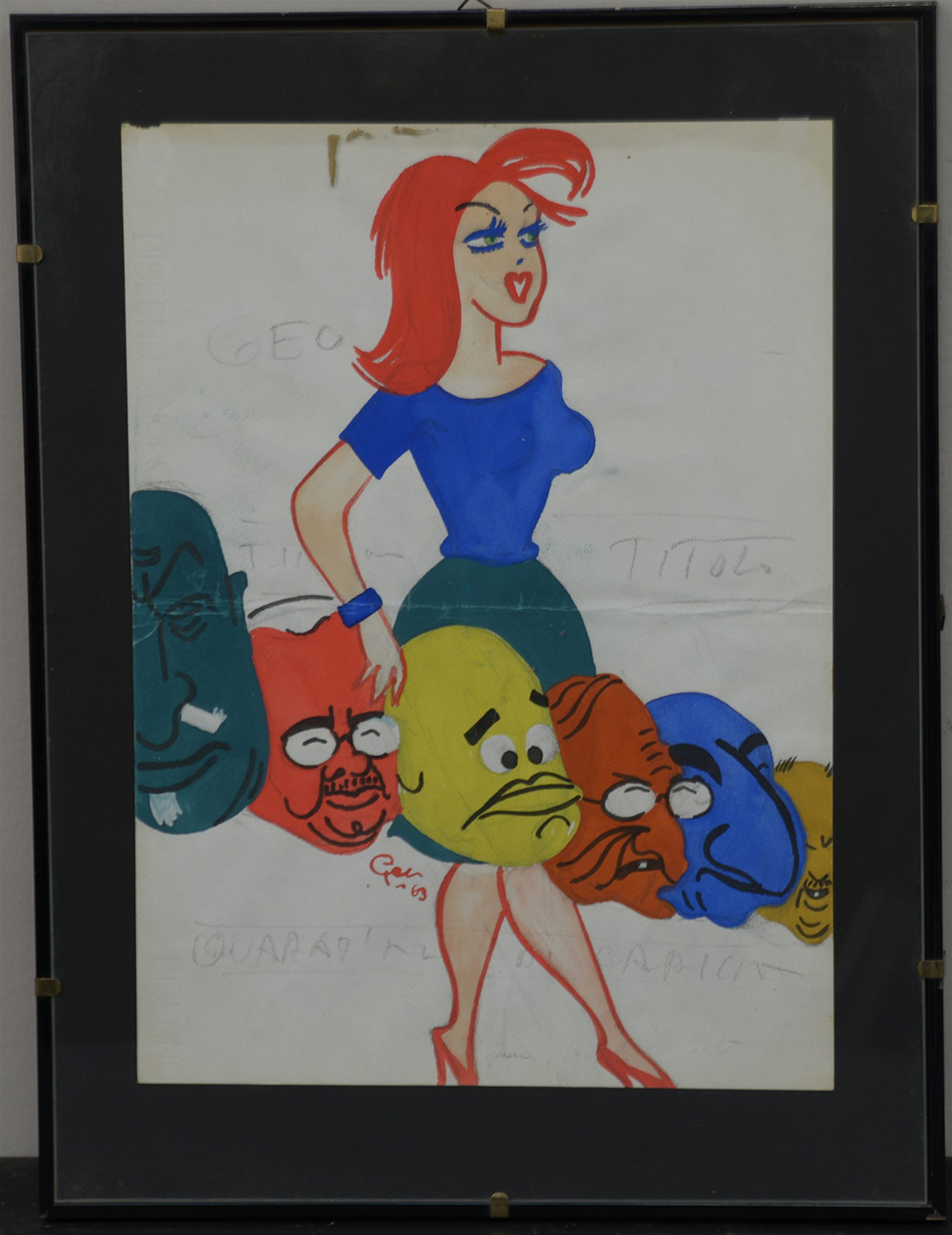 Enrico Gianeri (Firenze 1900 - Torino 1989) bozzetto per la copertina "Quarant'anni di caricatura" disegno a tempera (cm 33x24). Etichetta al retro della Libreria Antiquaria Peyrot, Torino. In cornice (difetti)
