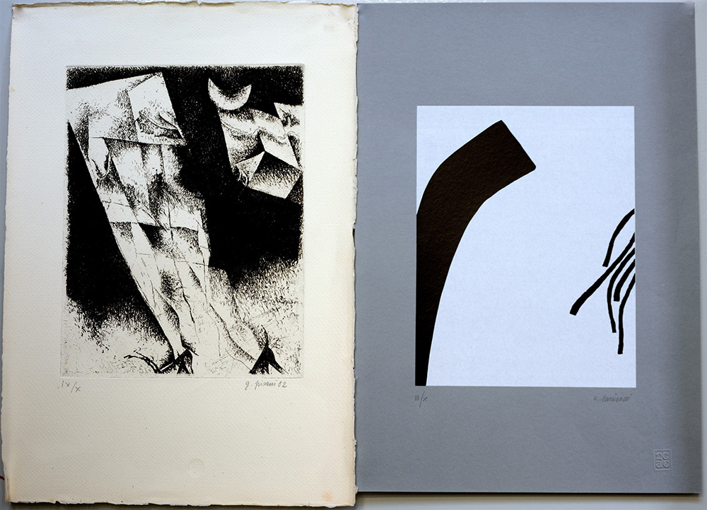 Cartella contenente un'acquaforte di G. Pisani es. IX/X e una serigrafia di R. Barisani, es. III/X, misure diverse, in cartella (lievi difetti)