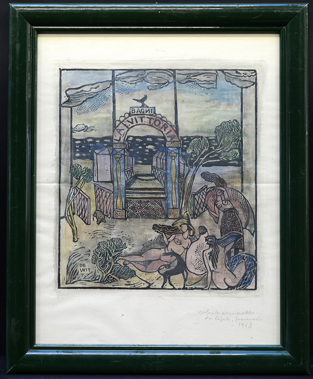 Antonio De Witt (Livorno 1876 - Firenze 1967) "Senza titolo" 1963, xilografia acquerellata (impronta cm 29x26,5; foglio cm 39,5x31) firmata nell'inciso in basso a sinistra. Inscritta e datata in basso a destra a matita, in cornice (lievi difetti)