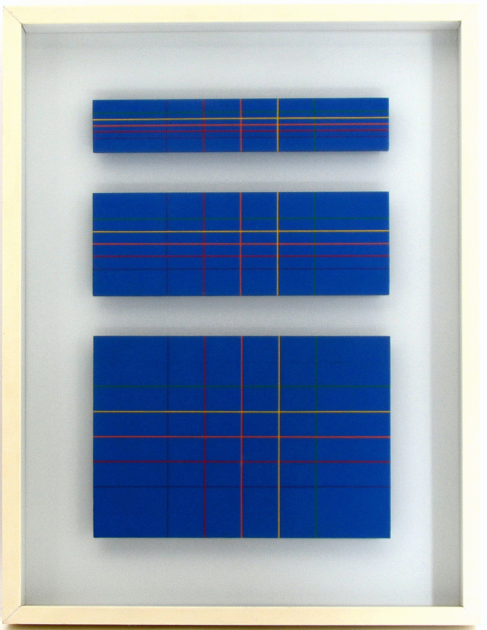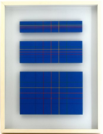 Paolo Minoli (Cantù 1942 - 2004) "Interazioni cromatiche modulazione tre tempi" 1975 acrilici su tavola (cm 51x38) firmato e datato al retro, autentica autografa e etichetta della galleria Lorenzelli al retro. In cornice