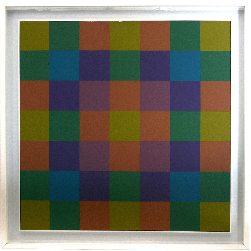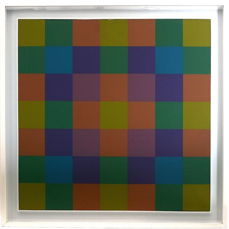 "Compenetrazioni reticolari..." 1974 acrilico su tela (cm 70x70) firmato, datato, titolato e descritto al retro. In cornice (lievi difetti)