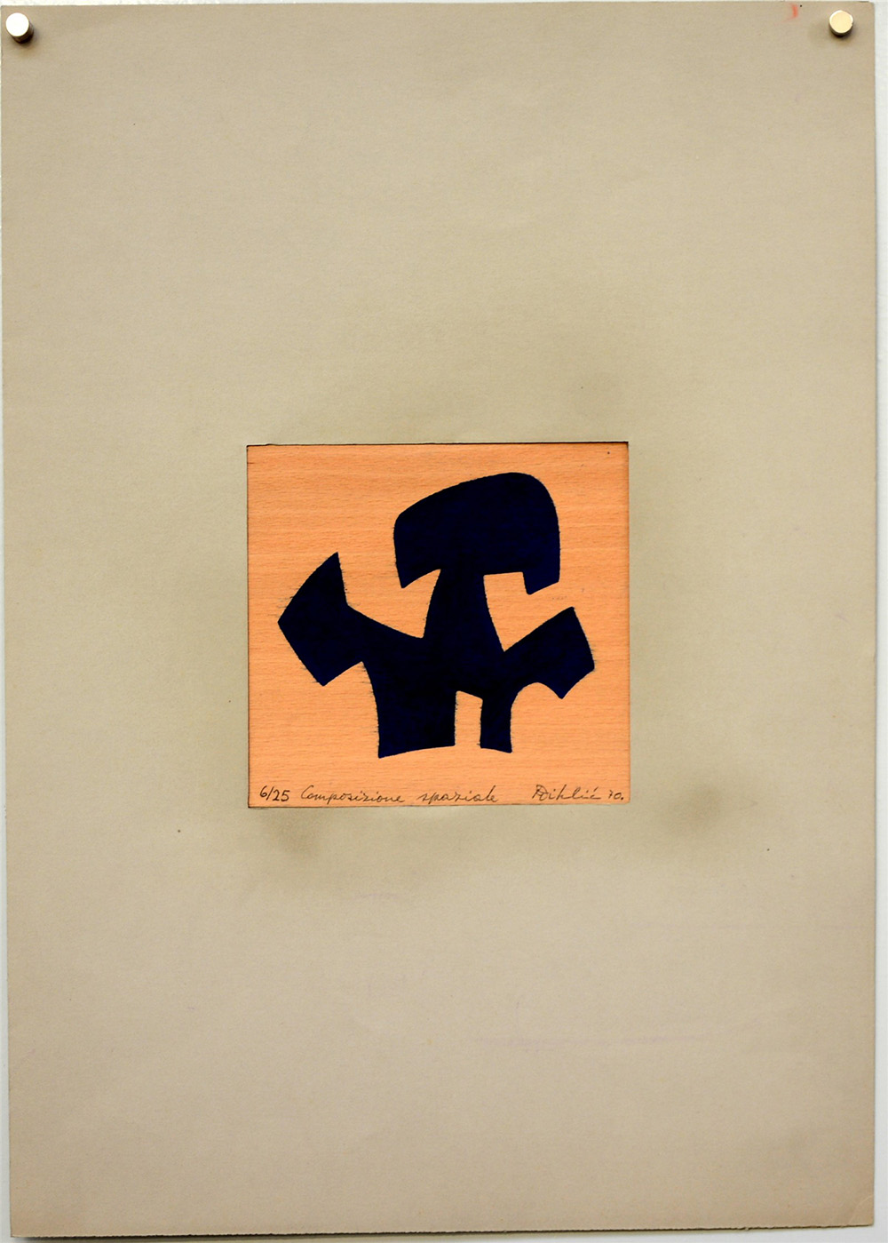 Firma indecifrata "Composizione spaziale" 1970, serigrafia su lamina in legno (cm 14,6x16,1) numerata 6/25, titolata, firmata e datata in basso a matita.