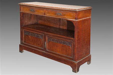 Manifattura Ducrot, Palermo. Credenza liberty in legno a due ante, ripiano a giorno e due cassetti, con ripiano in marmo rosso e maniglie in ottone. Sportelli riquadrati e decorati con bassorilievo ad intaglio raffiguranti tralci di vite e grappoli, inizi del sec XX (cm 135x105x47) (difetti e mancanze) -EN Credenza liberty in legno di noce a due ante, ripiano a giorno e due cassetti, con ripiano in marmo rosso e maniglie in ottone. Sportelli riquadrati e decorati con bassorilievo ad intaglio raffigurante tralci di vite e grappoli. Esecuzione Ducrot, Palermo, inizi del sec XX (cm 135x105x47)(difetti e mancanze) Wooden Art Nouveau sideboard with red marble top. Executed by Ducrot, Palermo, early 20th century (defects and losses)