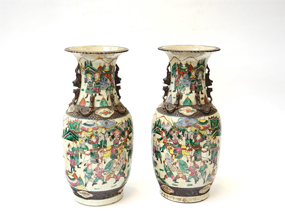 Coppia di vasi in porcellana decorati in policromia su fondo creaquelé a guerrieri e cani di Fo in rilievo, marchio apocrifo Chenghua alla base (difetti) Cina, sec. XX (h. cm 46)