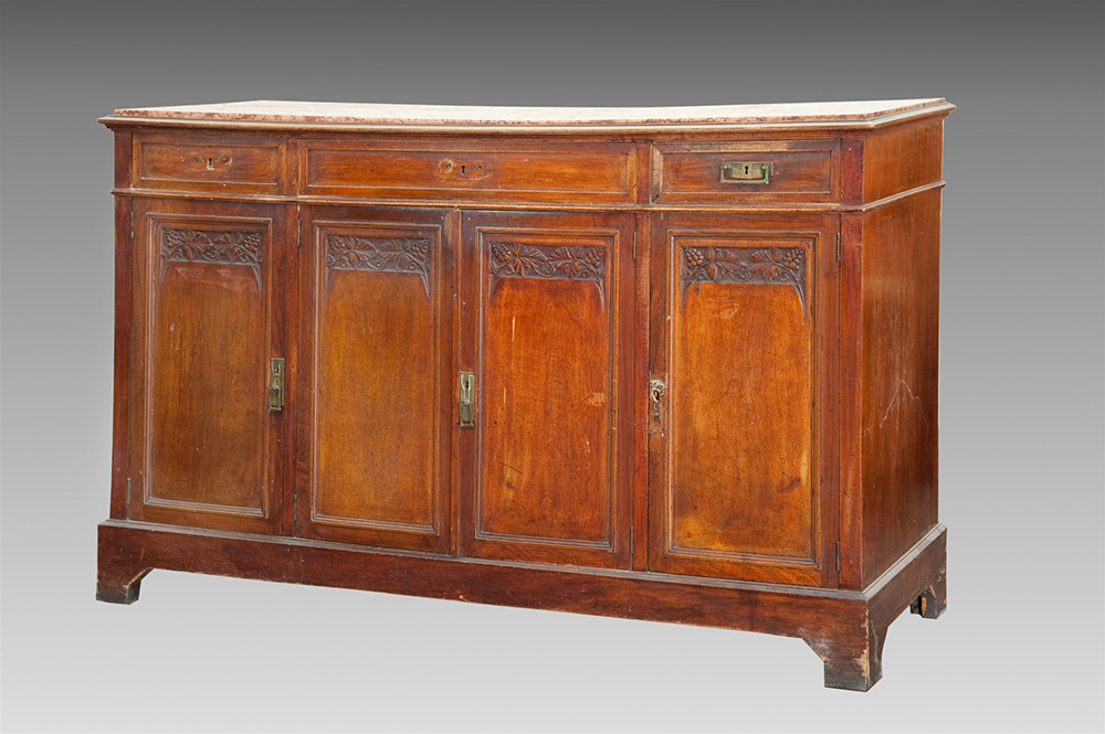 Manifattura Ducrot, Palermo. Credenza liberty in legno a quattro ante e tre cassetti, con ripiano in marmo rosso e maniglie in ottone. Sportelli riquadrati e decorati con bassorilievi ad intaglio raffiguranti tralci di vite e grappoli, inizio sec XX (cm 165x105x55) (difetti e mancanze) -EN Credenza liberty in legno di noce a quattro ante e tre cassetti, con ripiano in marmo rosso e maniglie in ottone. Sportelli riquadrati e decorati con bassorilievi ad intaglio raffigurante tralci di vite e grappoli. Esecuzione Ducrot, Palermo, inizio sec XX (cm 165x105x55) (difetti e mancanze) Wooden Art Nouveau wooden sideboard with red marble top. Executed by Ducrot, Palermo, early 20th century (defects and losses)