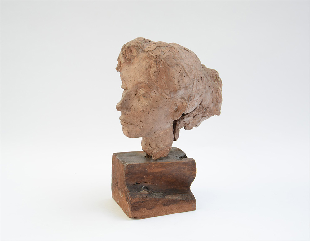 Lilian Tadini "Anna ciocca" scultura in cotto (h. cm 32) poggiante su base in legno. Etichetta alla base (lievi difetti)