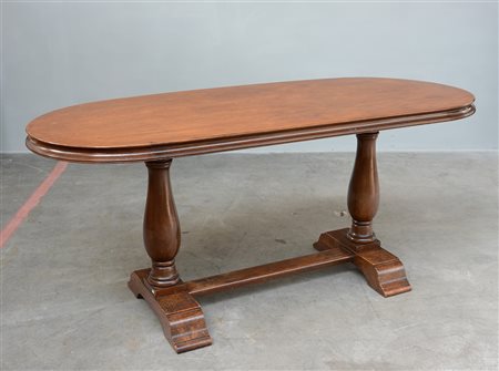 Tavolo ovale con gambe tornite poggianti su piedi sagoamti riuniti da...