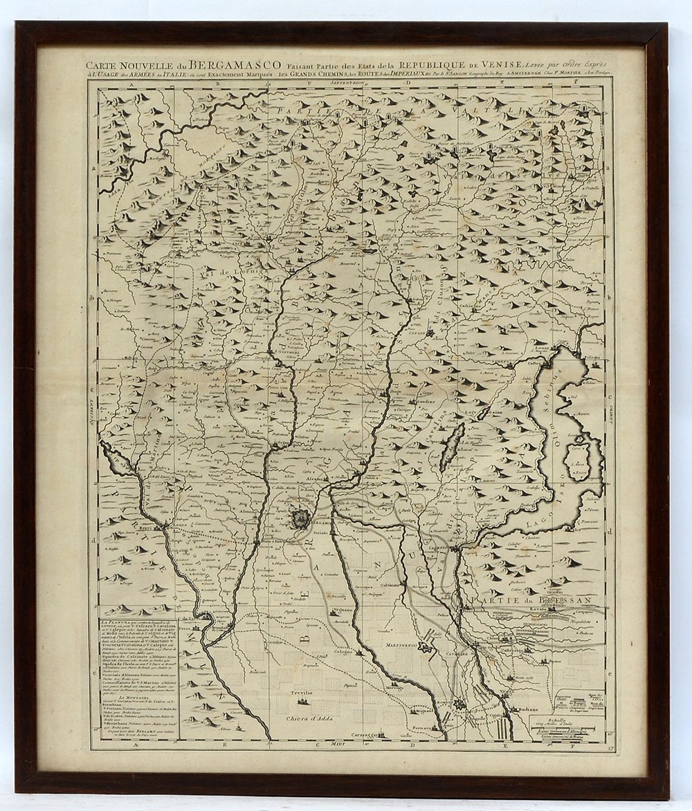 Riproduzione di un'acquaforte di Mortier "Carte nouvelle du Bergamasco..." (cm 65x52) In cornice (difetti)