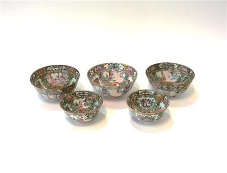 Gruppo di cinque ciotole in porcellana Famiglia Rosa cantonese decorate con scene di palazzo. Misure diverse (lievi difetti) Cina, sec. XX