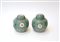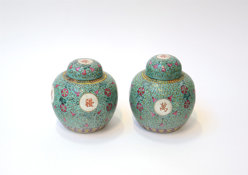 Coppia di potiches con coperchio in porcellana Famiglia Rosa a fondo turchese con calligrafia e motivi floreali (lievi difetti) Hong Kong, sec. XX (h. 14 cm.)