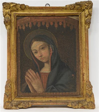 Antico dipinto raffigurante la "Madonna in preghiera" olio su tela (cm 45,5x36,5), in cornice intagliata e dorata (difetti e restauri)