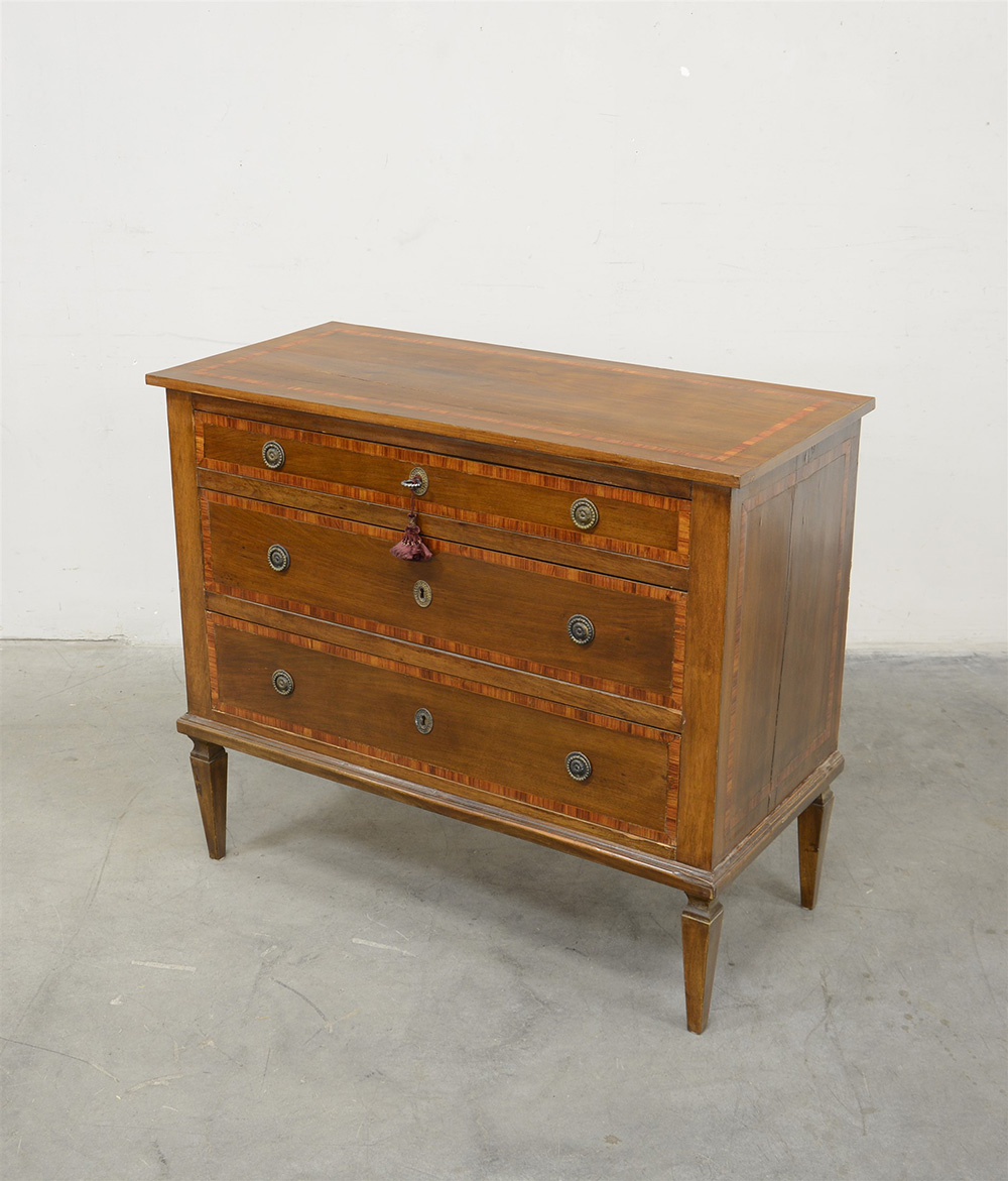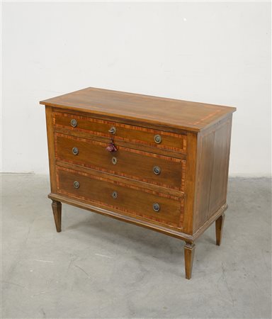 Comò a due cassetti grandi e uno piccolo sotto il piano, decorato con cornici a contrasto, piedi rastremati (cm 111x94,5x52) (difetti)