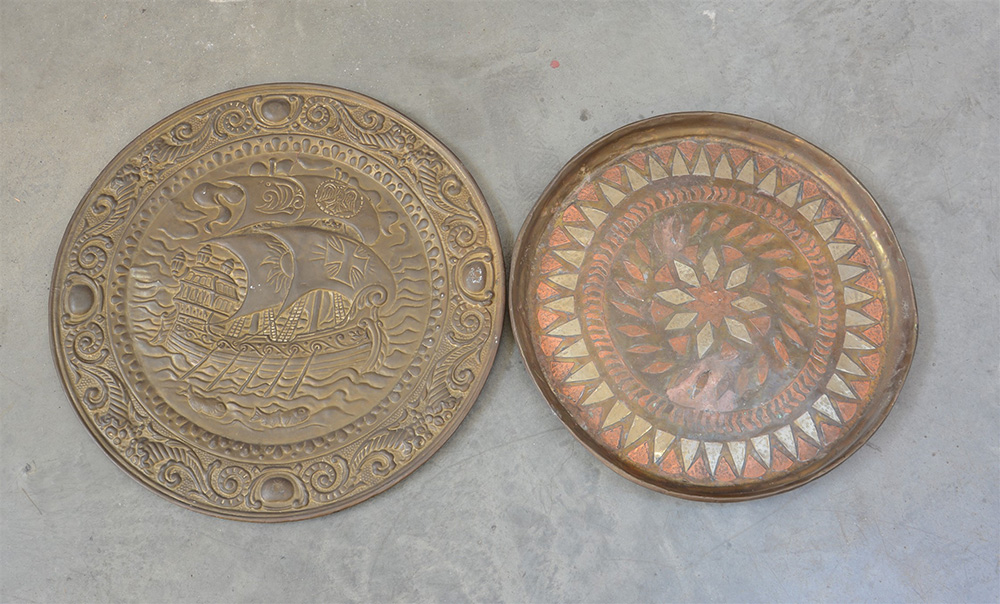 Lotto di due piatti decorativi in rame (d cm 55 e 63) (difetti)