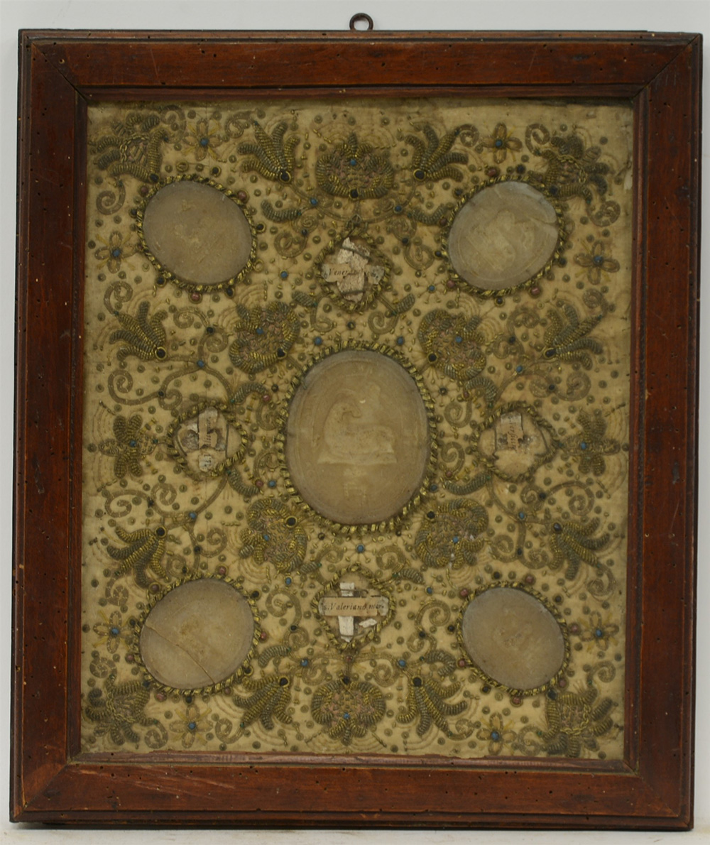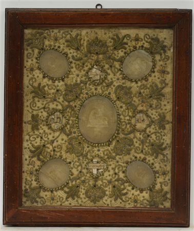 Arte del secolo XVIII, reliquiario ricamato in cotone e filato metallico color oro e argento con decori a volute e fiori in altorilievo e perline colorate in pasta vitrea; completo di cinque medaglioni in cera e reliquie di quattro santi; in cornice (cm 37x26) (difetti e mancanze)