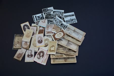 Scatolone contenente numerose carte de visite e ferrotipi di soggetti vari,...