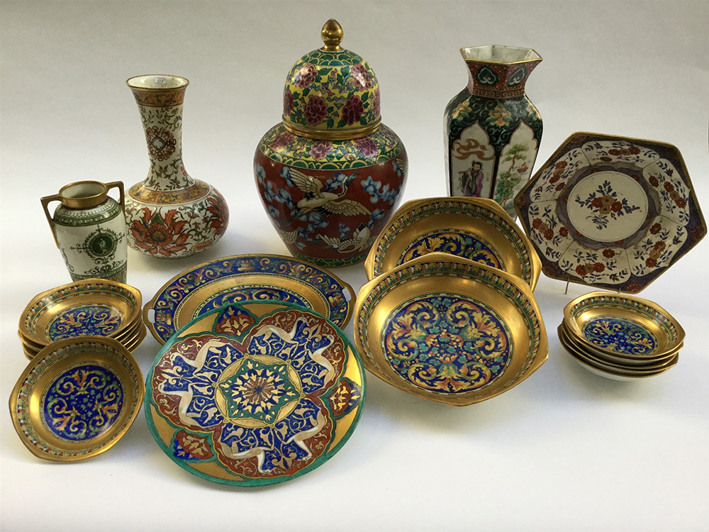 Lotto di porcellane dipinte in policromia da Ada Ambrosetti negli anni '30 del sec. XX su manifatture differenti, composto da una potiche, tre vasi, dodici coppette, due piatti e tre insalatiere; firmati e datati sotto le basi (difetti)