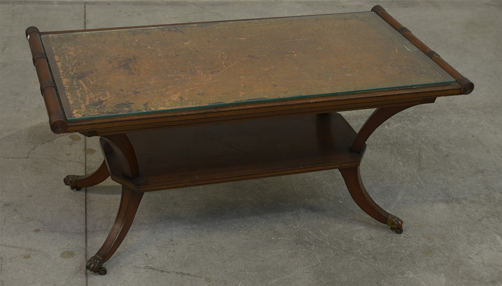Tavolino rettangolare in legno con filettature ebanizzate, gambe mosse munite di rotelle. Piano in cuoio con impressioni a secco (105x49x50)(difetti)