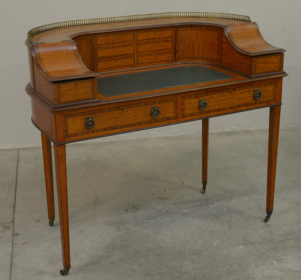 Scrivania inglese decorata a piccole filettature con due cassetti nella fascia, alzata con numerosi cassetti e vani portaoggetti. Piano con inserto in pelle verde, gambe rastremate munite di rotelle. Inghilterra sec XX (cm 114x100x61) (difetti)