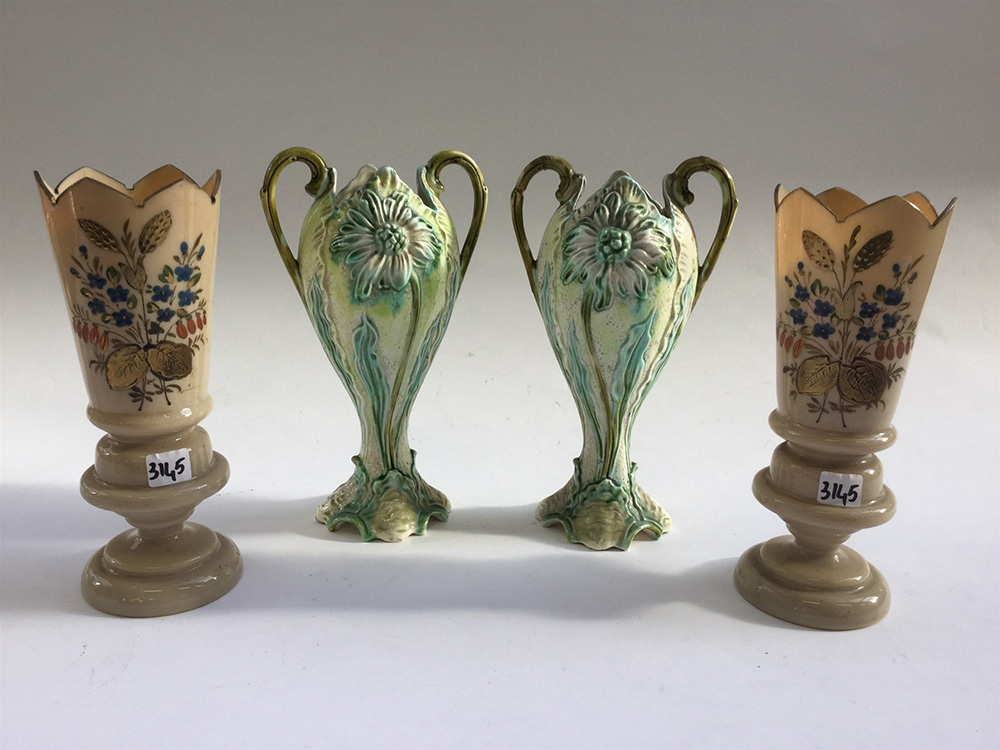 Lotto composto da una coppia di vasetti biansati art nouveau in ceramica policroma decorata a foglie e fiori, e una coppia di vasi merlati in opaline con decoro a mazzi di fiori (h cm 25 circa) (difetti e restauri)