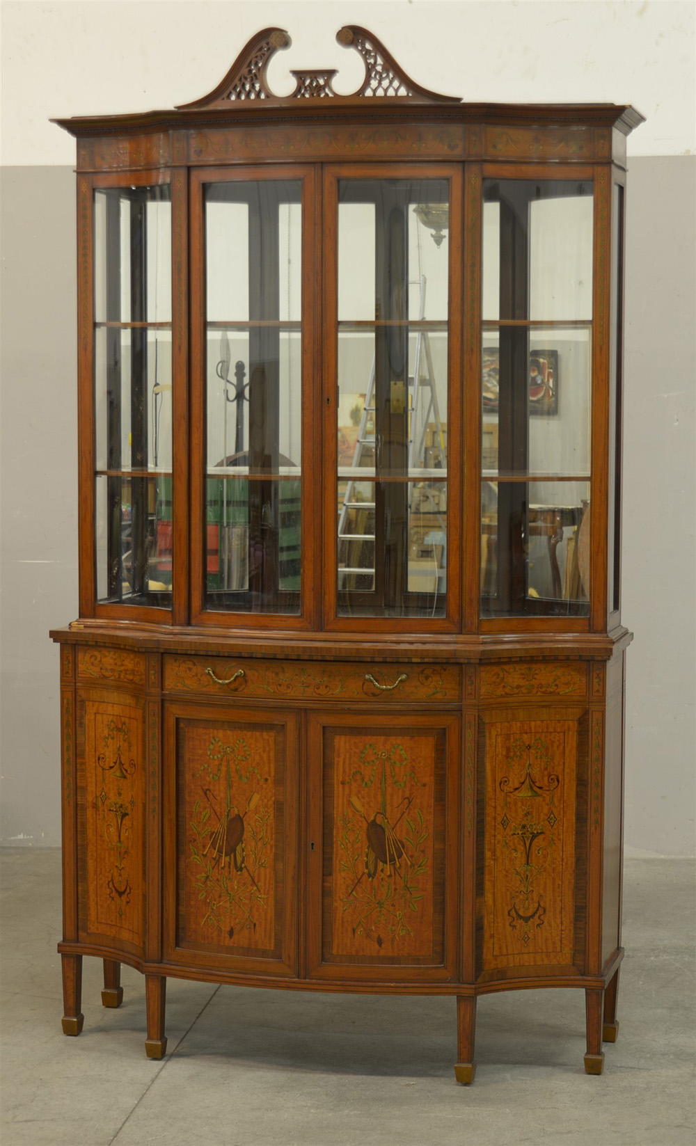 Mobile vetrina a due corpi in legno satinwood con fronte mosso, parte inferiore con cassetto e due battenti. Inghilterra sec XX (cm 123x215x50) (lievi difetti)