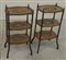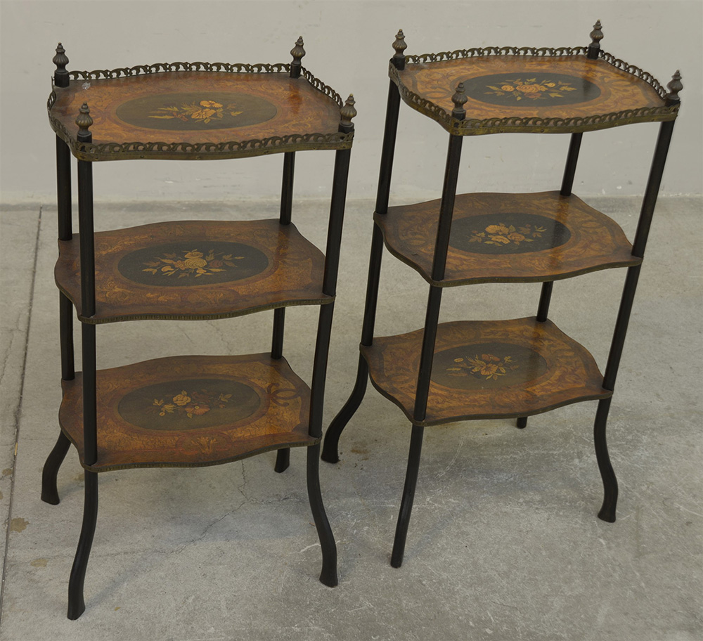 Coppia di etagere a tre ripiani con montanti ebanizzati, piani decorati con intarsi floreali, ringhierine e fiamme in metallo (cm 41x81x30)(difetti)