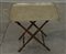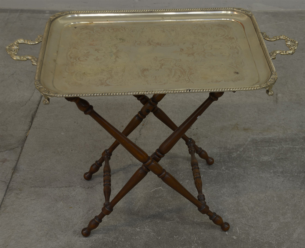 Vassoio rettangolare biansato in metallo argentato con piano inciso a volute e piedini ad artigli, completo di sostegno pieghevole in legno tornito (vassoio cm 78x45)