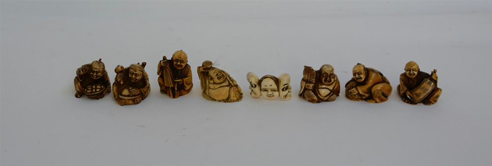 Gruppo di sette netzuke in avorio raffiguranti figure folcloristiche e maschere da teatro (difetti) Giappone, sec. XX