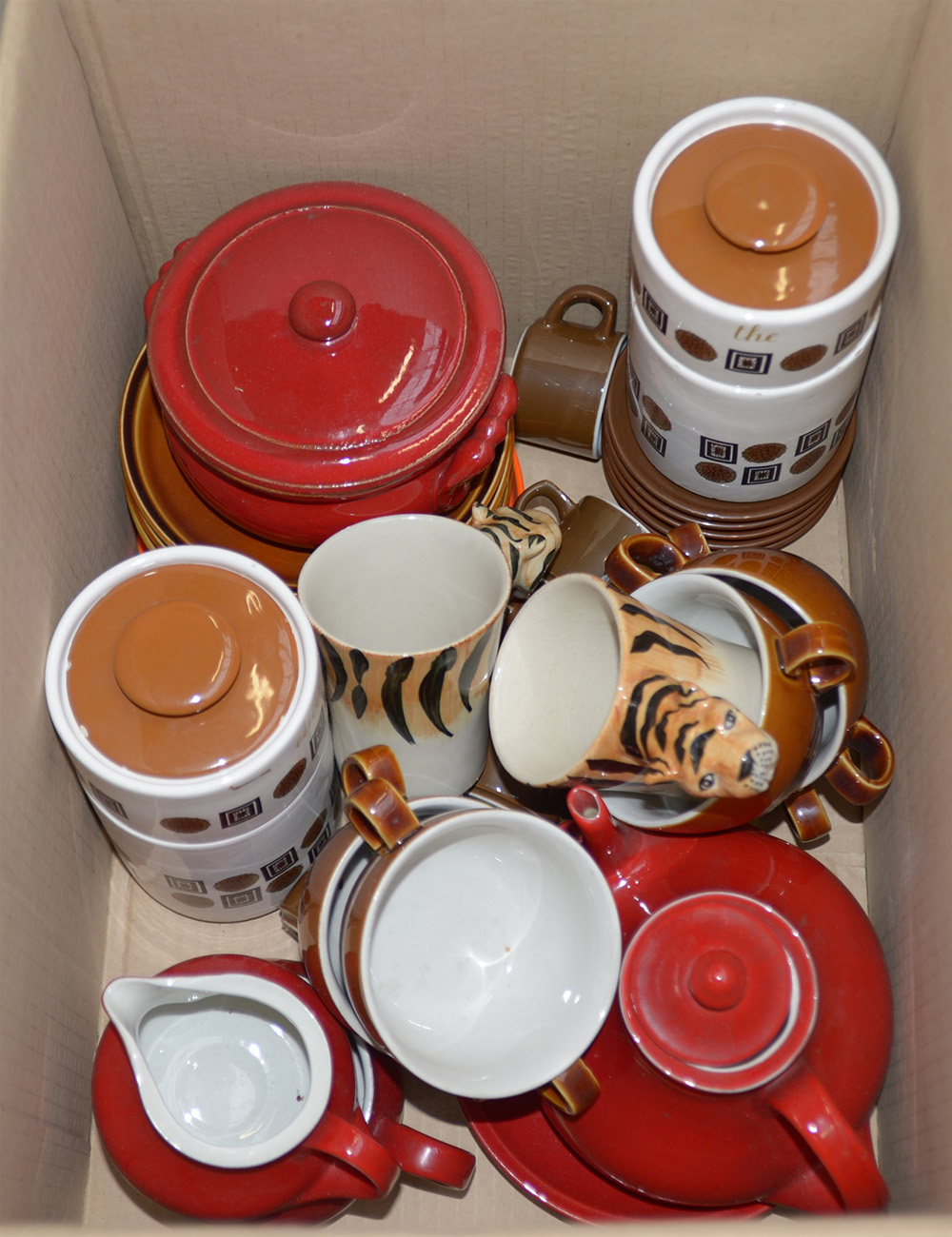 Cartone contenente numerosi oggetti per la tavola in ceramica smaltata rossa e marrone (difetti)