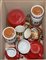 Cartone contenente numerosi oggetti per la tavola in ceramica smaltata rossa...