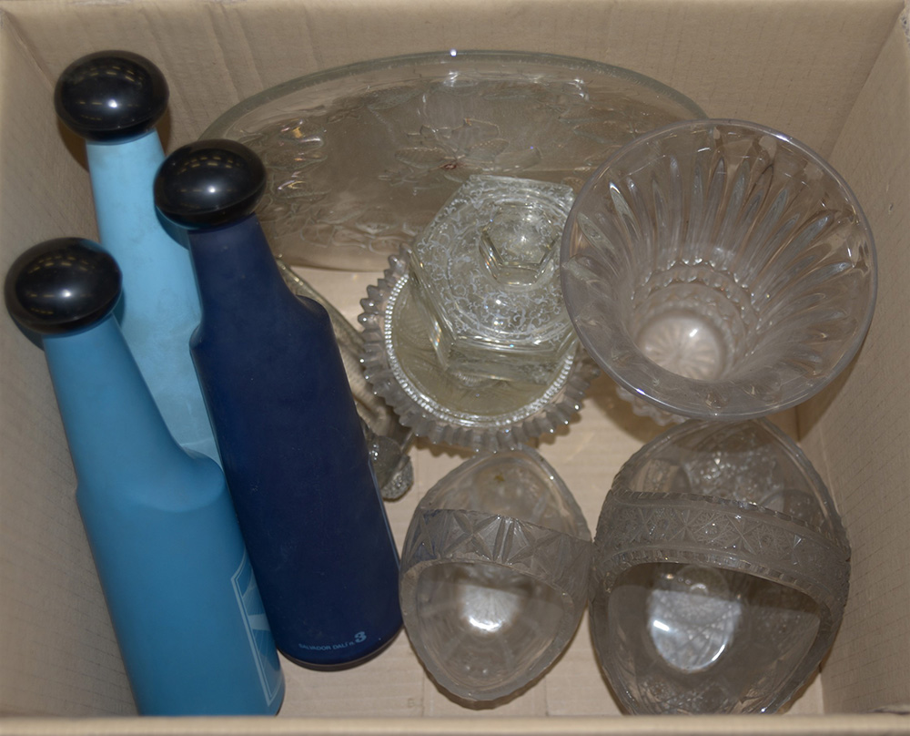 Cartone contenente numerosi oggetti in cristallo e tre bottiglie in vetro (difetti)