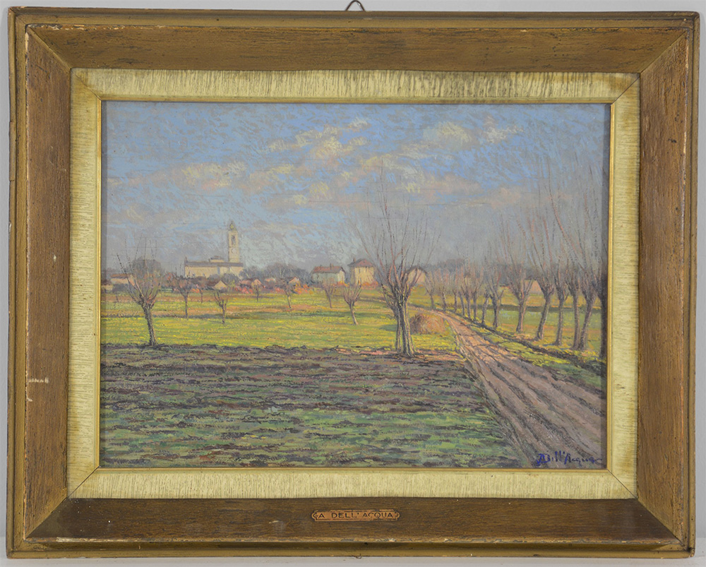 Aldo Dell'Acqua "Cuggiono" 1944, olio su cartone pressato (cm 31x41) firmato in basso a destra; titolato, firmato e datato al verso, in cornice (difetti)