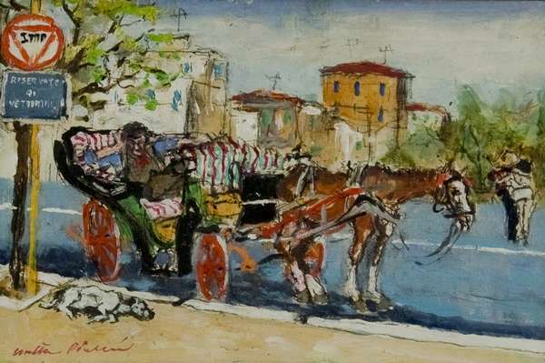 Walter Piacesi Fiacre in sosta lungo un viale alberato olio su tavola cm. 20x30 Firma in basso a sx Autentica dell'artista su foto; Archivio dello Studio Associato Peritale d'Arte e Antiquariato Prof. Giordano Viroli e Cristiano Ragni n. rep. 101SEE/8 (Forlì) Sul retro etichetta della Galleria Luisetto Arte Contemporanea